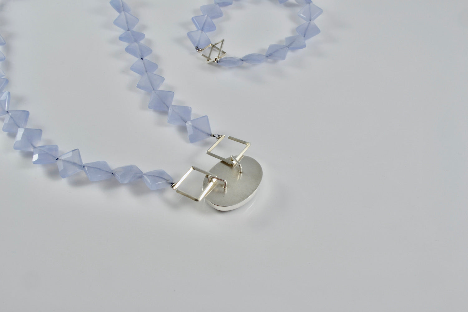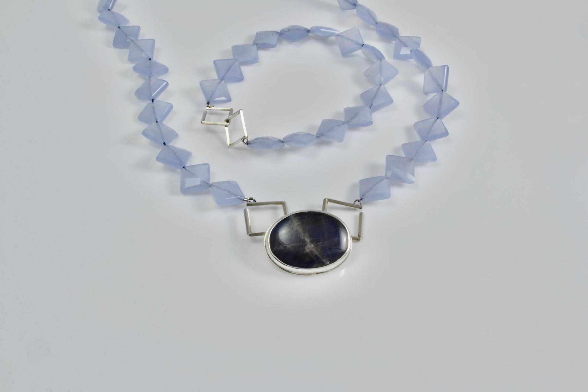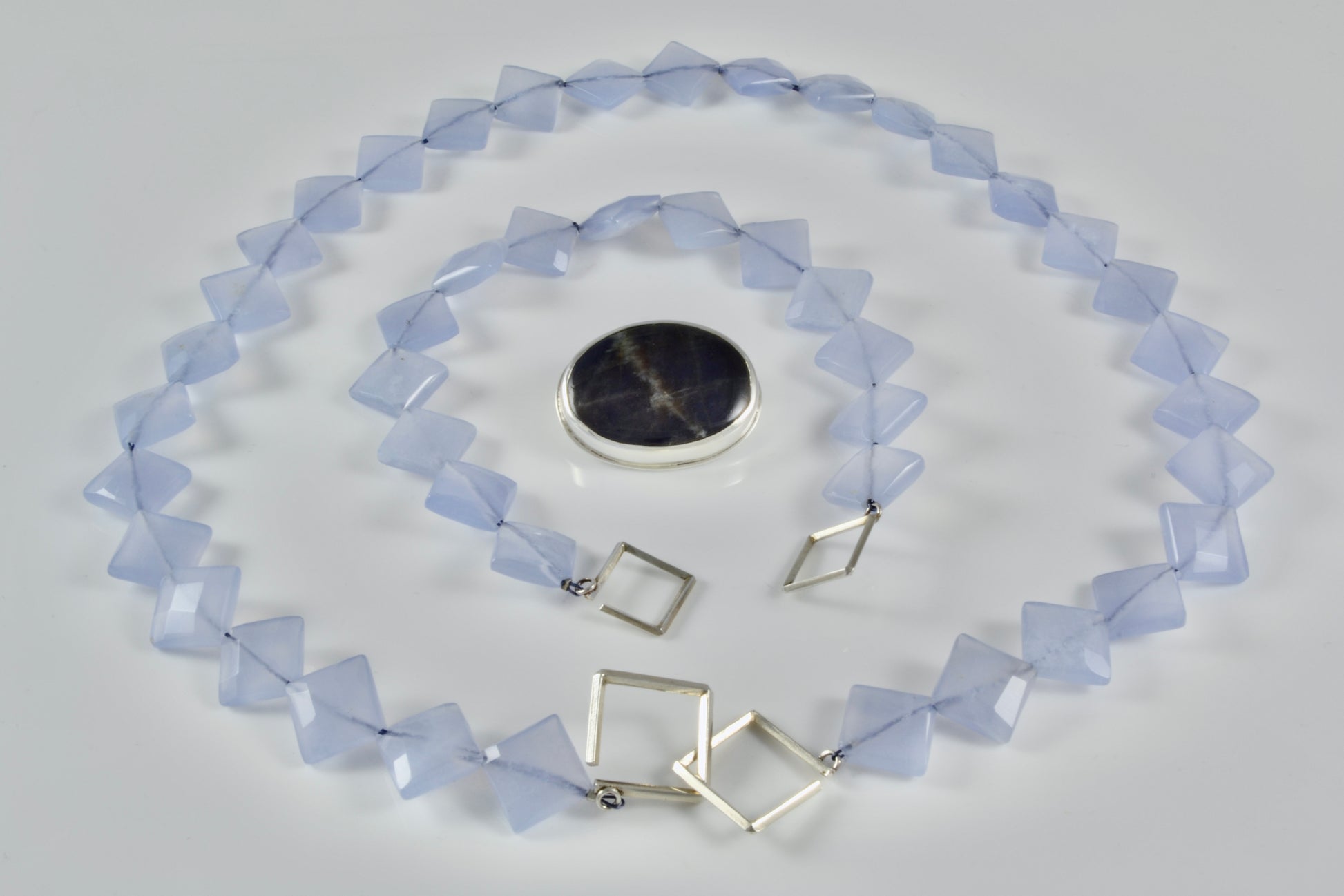Necklace with pendant measures 18” long. Chalcedony beads are 10mm square (about 3/8”)