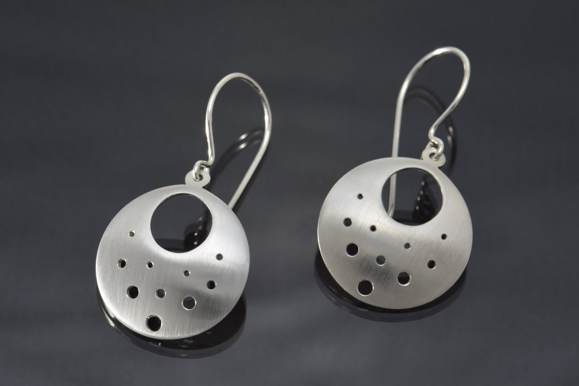 When you look at these, perhaps you imagine a sun and surrounding stars (after all, it is part of the UFO collection!) The silver circle is lightly domed with a brushed texture on the front, and brightly polished cut-out dots. Somehow, though, I thought Freckles was a better name for this pair of earrings. The dots remind me of freckles that become even more prominent when they are enhanced by the sun!