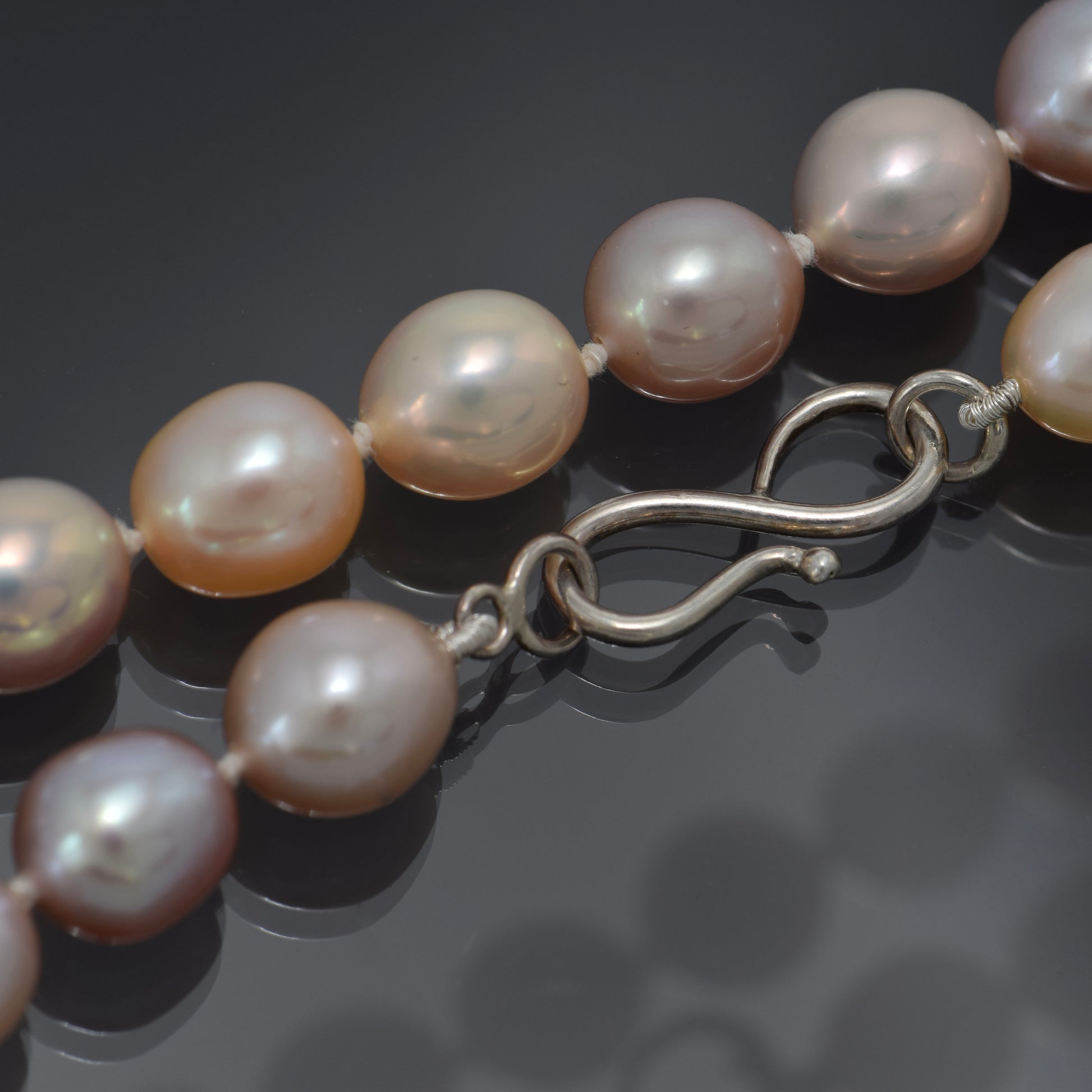 Amazing golden luster shows through on this beautiful pearl necklace. The freshwater pearls are around 9mm and the clasp is hand crafted in sterling silver.