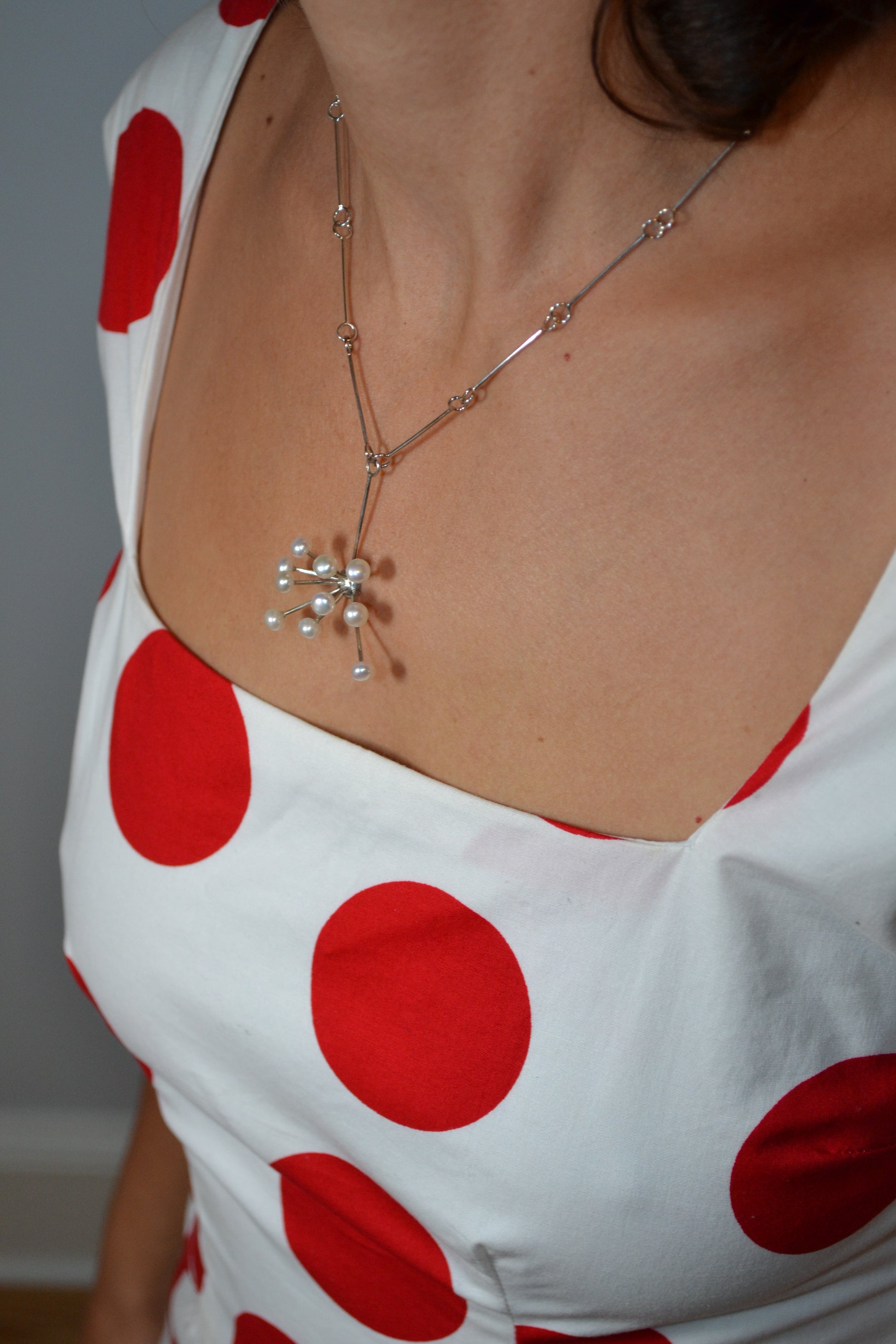 Smooth white freshwater pearls punctuate the ends of sterling streaks of this piece.