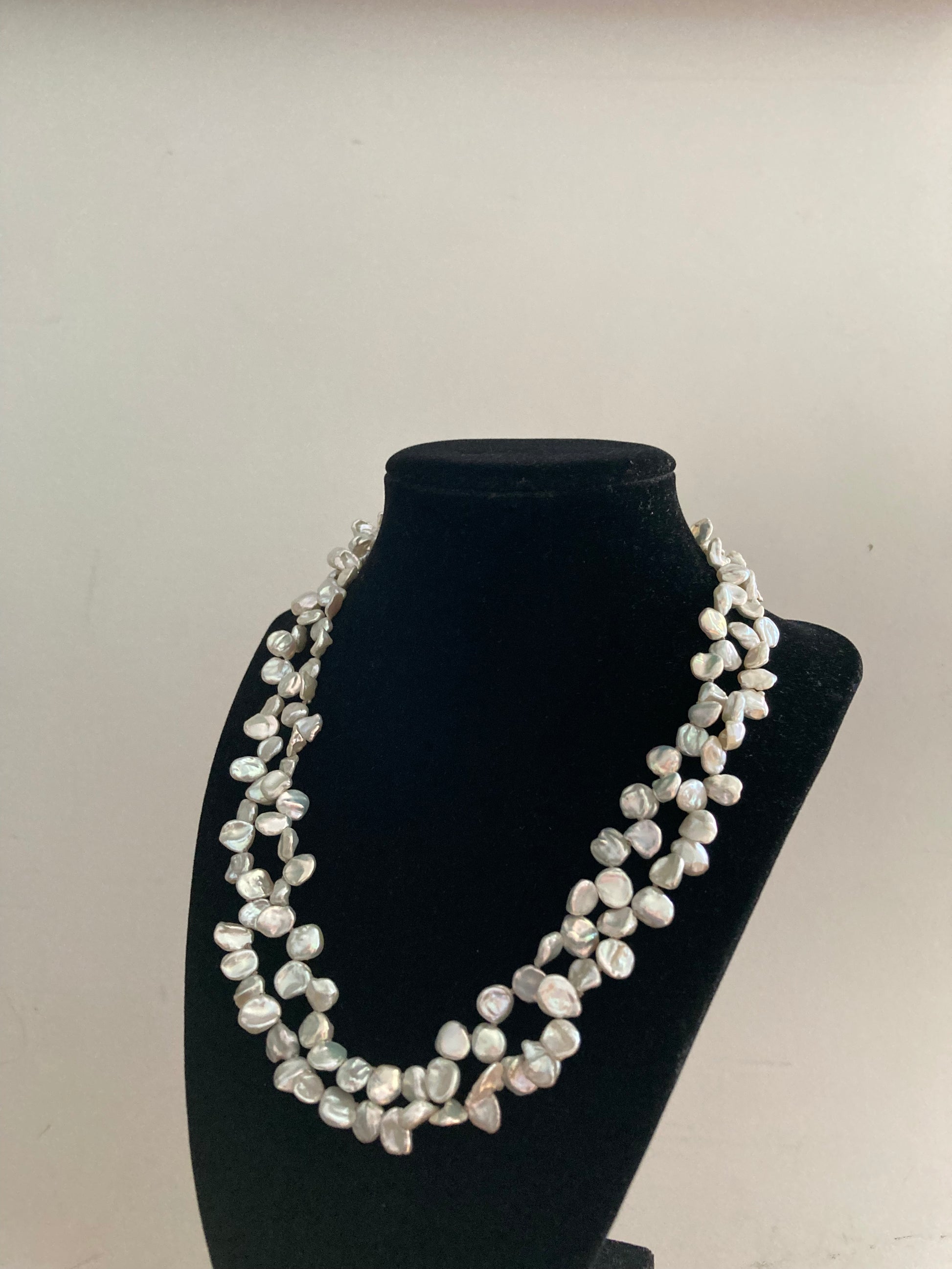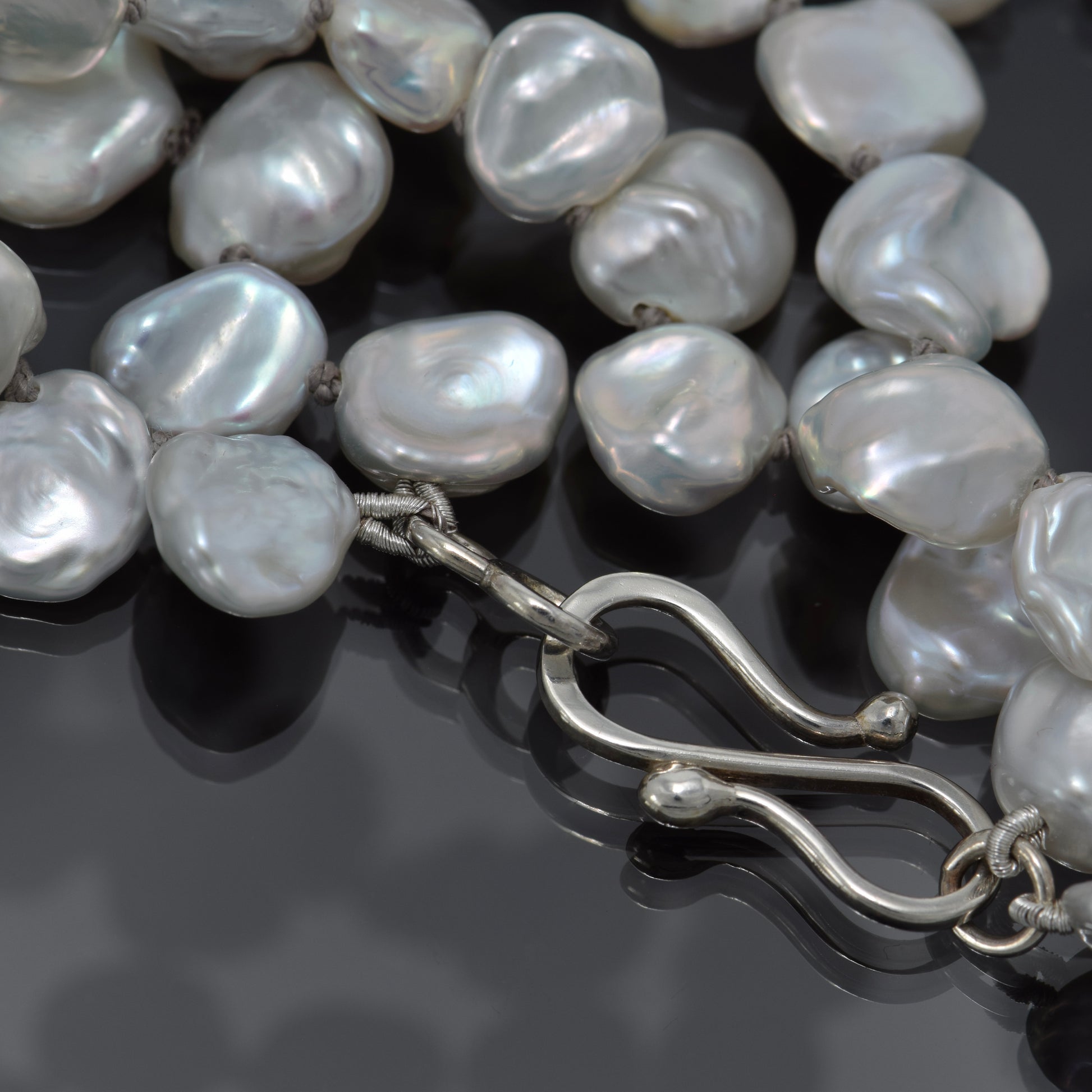 Two strands of silver keshi pearls come together with a handcrafted sterling clasp.